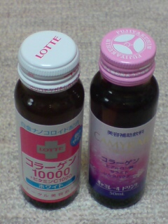 まず、左。『飲みやすい』と書かれてあったロッテのコラーゲン10000ってやつ。オレンジ果汁とかマンゴー果汁が入っているらしい。飲んだら、オレンジだかマンゴーだかよくわからん味がした。とりあえず、多少すっぱい。。。。。資生堂とかコナミのに比べたら、味は・・・・だな。でもコラーゲンが10,000mgと白金が入っている。ビタミンCも入っている。ホワイトって書いてあるってことは、美白にもきくわけ