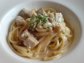 パスタは、二人とも一緒のを選択。クリームパスタ。鶏肉と蕗と玉ねぎが入っています。リングイネなので、結構太い麺。蕗って美味しいんかなーって気がしたけど、美味しい。