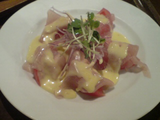 最初、ちょっと・・・って思ったけど、食べてみたらおいしかったのがこれ。トマトにチーズと生ハムのせて、上から柑橘のドレッシングかけてるの。おいしかったー。また食べたい。