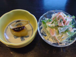 富士山が真ん前に見えるお店。そこで、サクラ海老のかきあげを食べたくてやってきたのです。最初に出てきたのは、大根(ふろふきだいこんってやつ???)とサクラ海老がはいったサラダ。おいしい。