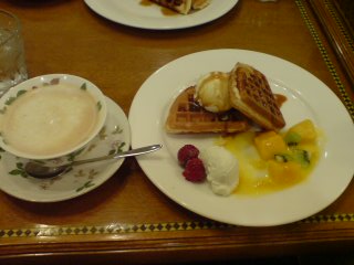 はい。はしごしました。ワッフルと紅茶です。この時点で、リカの酔っ払い度は最高潮。頭がぐらぐら。「ははは。お腹いっぱいなんだけどー。もー、お腹裂けてなんかでてきそー!」とかって笑いながら、なんか食べてるし。喋ってる内容もなんかおかしいしー。