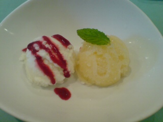 デザートは、ヨーグルトと金柑のソルベというのを私が選択。父と母は「読んでもなにかわからない」と言うので、「クレームブリュレにしたら?プリンみたいな感じのものやし」と言うとそれにしていた。妹はマンゴーのムース。