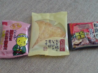 これは、職場でもらったお土産。左は伊勢うどんのベビースターラーメン。真ん中は熊本のリーフパイ。右が松阪牛のせんべいwwww