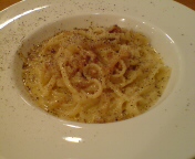 はい。私のパスタ。カルボナーラです。パスタはリングイネというやつ。リカ、このリングイネって好きなんだよね。なんかスパゲティが2つくっついたぐらいの太さのやつで。先輩はたりらりらーんみたいな名前の太いパスタのを頼んでいたよ。うにとかトマトとか入ってるやつで、すごいにんにくのにおいがした。ちょっとだけ、交換して食べたけど、絶対、リカの方がおいしい。間違いなくおいしい。このベーコンみたいなブタの干肉がパンと一緒に食べたら、すごいおいしかった。