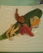 こうやって、立て続けに写真を撮っていると、先輩が「全部写真に撮るの?」と聞くので、「うん。だってね、ブログの方は女の人多いから、焼肉の写真とかより、こんな方が好きかもしれんやん?」と言うと、「へぇ。リカちゃんってまめよねぇ。。。。」と妙に感心されてしまった。これは、玉ねぎが上下に載せてあって、下の方はバターで焼いた玉ねぎ、上のほうは生の玉ねぎ。真ん中には、手羽先の塩焼きみたいなのが挟まれてた。私たちって、「この食材はなんですか?」「あのね、これってどういうものなのですか?」とかたまに聞くのね。面白いものが入っていたら、そう言うの聞いてみたりするの。でもね、今回運んでくれたお姉さんは、思いっきりアルバイトみたいで、聞くたびに「ちょっとお待ちください」と言って、シェフを呼んでくるのよ。wwwんで、シェフがいちいち説明してくれるの。