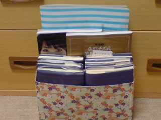 いれてあるのは、文庫本とかです。後ろの水色のストライプのファイルは、雑誌の切り抜きを入れてあるファイルです。主に美容関係の切抜き。これをローションパックの時に暇だから見て、「ほー。なるほどねー」とかやってるわけですwwww