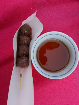 お綱茶屋で一休み。古代米をつかったみたらし団子です。その後、二人でお土産物を見たりしました。