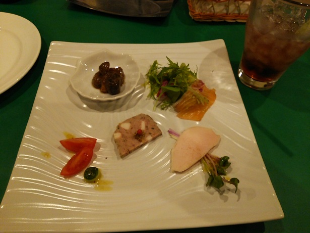 前菜。二人で行くのは初めてです。スモークサーモンとかパテみたいなものとか何種類かのってました。私は、あまり前菜は得意ではないのですが、彼はおいしいって言ってくれていたので、満足。(笑)