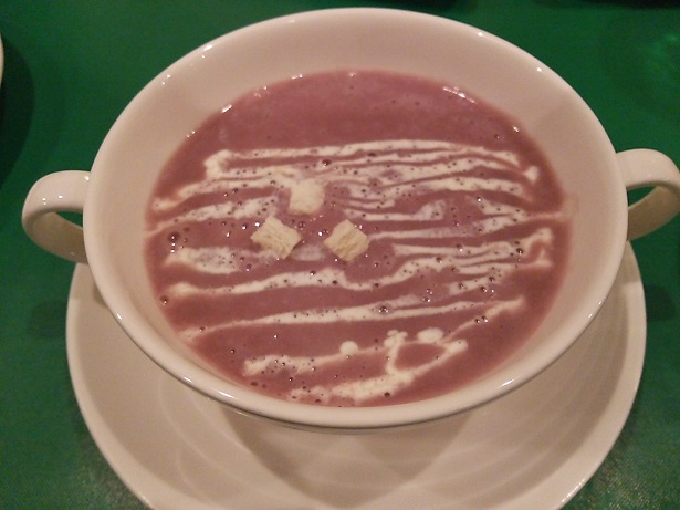 スープは紫芋のポタージュか、野菜たっぷりのブイヨン。私は紫芋を選択。色がきれいでした。彼は野菜たっぷりのブイヨンスープを頼んでました。