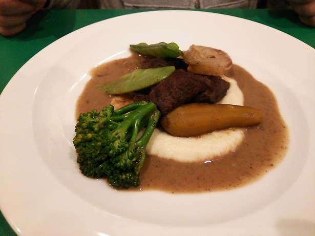彼は、なんと鹿肉の煮込みみたいなのをチョイス。おいしいって言ってました。ジビエ料理だー。