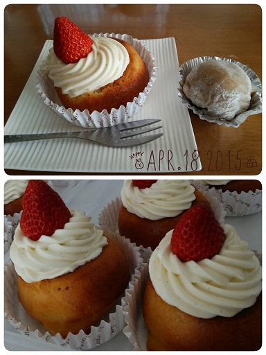 生地もいつもよりずっとゆるい。それをカップに入れて焼いて、その後、シロップに浸して。。。。カスタードと生クリームの混ぜたクリームをのせて、イチゴをのせて完成!