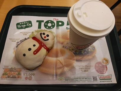 クリスピードーナツで食べた雪だるまドーナツ。クリスマスだからかな。