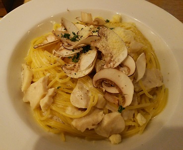 クリームパスタのセットに。サラダのセットを頼もうと思ったのに、何を間違ってかドルチェのセットにしてしまったらしい。寒そうにしてたら、足にかける毛布をかしてくれました。