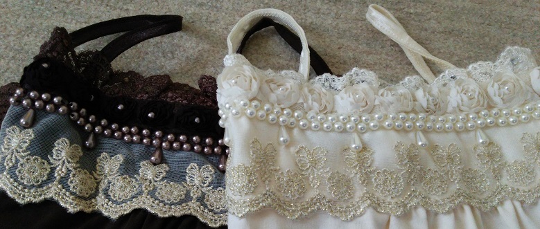 アップにしてみたら、こんな感じです。上の方にバラのコサージュっぽいものがライン上に並んでます。ほかにも真珠みたいなのとか色々ついていて、結構きれいなのがいいなと思って購入しました。
