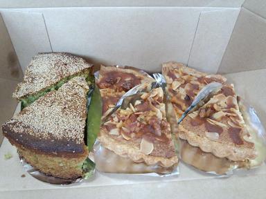 そこではケーキも売っていたので、買ってみましたw抹茶と小豆のケーキ、ナッツのタルト。