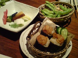 夜は居酒屋。天むすとか枝豆とか漬物の盛り合わせとか。