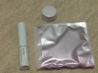 左が口紅。上のが口紅を塗る前に塗る保湿効果のあるもの。真ん中の四角いものはファンデーションのサンプルです。口紅以外はサンプルで、もらいました。