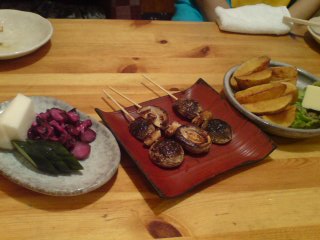 ピカコさんが左の漬物の盛り合わせを注文。(青い服が見えてるけど、この人がピカコさん)しいたけも、確かピカコさんとリーダーの梅ちゃんが注文した。右のポテトフライはインカの目覚めで作られている。