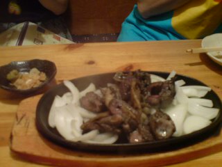 リーダー梅ちゃんがみんなに「もっと酒をのめー」と言って次々と注文するように言っていた。wその時に、しゃものあぶり焼きを頼んだのだが、なかなかかたく・・・・。(梅ちゃんは左の方)梅ちゃんはしゃもの呪いで、クーラーがききすぎてチキン肌になるという現象が。。。。。(違