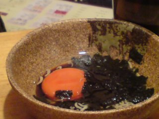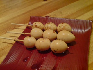 ピカコさんの注文した鶉の卵。一番奥のほうの卵にたれから出たような野菜???みたいなものがかかってあって、酔っ払いリーダー梅ちゃんは「この卵、にきびになってるー!」・・・・・ぇ?