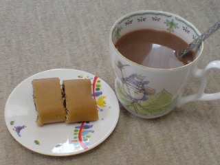 毛利の殿様巻きという萩のお菓子。ちなみに、このトトロのマグカップは私専用です。wwww上の方の画像の常滑焼もお誕生日にもらったので、私専用ですが。