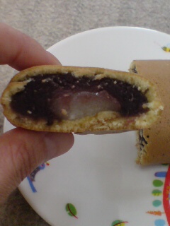 このお菓子、中におもちが入ってます。