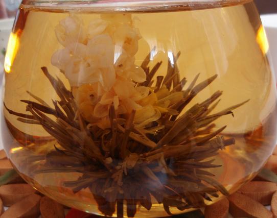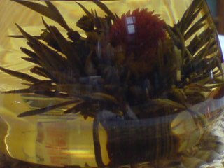 こちらは、わかりにくいですが赤い花と黄色の花がでてくる工芸茶。このジャスミンティは白いお花のよりは匂いも味もきつめ。