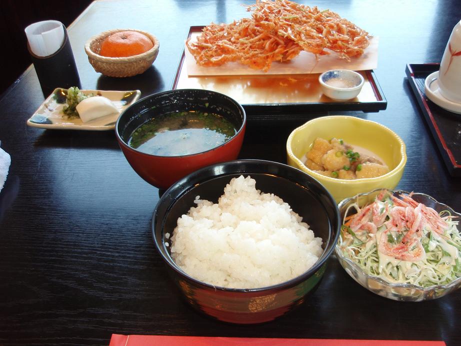 うまいこと写真が撮れませんでしたが、かき揚げはかなり大きめ。2つお皿に乗ってるけど、でかいの。さすがに食べ切れなかった。