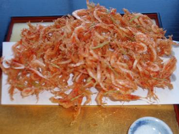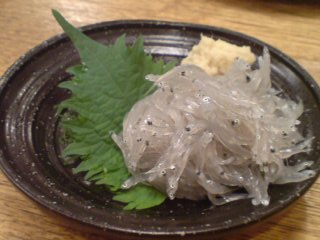生のしらす。しょうが醤油で食べるらしいです。食べてみると案外おいしいですね。ちなみに、うちのほうでは、大根おろしとポン酢だったので、しょうが醤油ってのが珍しかったのでした。wちなみに、しらすの生も初めて食べました。