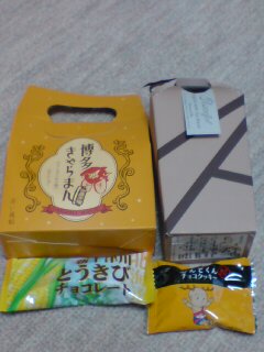 そして、こんなのをもらいました。Hやんからもらった、きゃらまんというキャラメルのお饅頭。これ、めっちゃうまい!!!博多の名物なのかしら???右上はUさまからもらった、紅茶です。アフタヌーンティで買ってくれたらしい。とうきびチョコレートはAちゃんから。ホワイトチョコレートをかけたようなお菓子で、おいしかった。せんとくんのお菓子は、隣の席のおねーさんから。