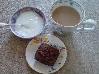 紅茶、ヨーグルト、ブラウニー。ちょっと食べすぎってぐらいなんだけど。