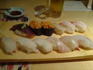 夜は築地でお寿司。・・・・んー、微妙。高いお店ならおそらくおいしかったのかも。でも、リカたちが行ったお店はチェーン店なんだって。値段はそんなに高いわけでもなかったんだけど。だからかな。。。。微妙。(白身魚のひらめが臭いと感じるなんてありえない。。。。と思ったんだけど。。。。)店選びは大切かも。。。。