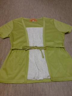 ちょっと写真だと色がキレイにでてませんが、きれいな明るい鶯色???黄緑???って感じの色です。SunaUnaにしては、これ値段も安くて。色違いで妹のも購入。胸のところはレースです。(透けないように裏地がついてます。)リボンと言うかひもと言うか。。。って感じのは、取り外し可能ですw