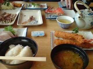 まず、20日に名古屋に。12時半ごろ到着。お友達との待ち合わせ場所には13時ちょっとすぎに到着。そこから知多半島の先っぽへ。。。。そこで、このご飯。(お昼ご飯だよー)これに、煮魚、焼き魚、焼き海老がまだありました。大きなエビフライとか、シャコとかお刺身もありました。なんかお腹いっぱい過ぎてリカはほとんど食べられなくて、友達がいっぱい食べました。