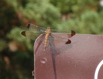 看板に赤とんぼが。お昼寝かな?近づいても逃げません。