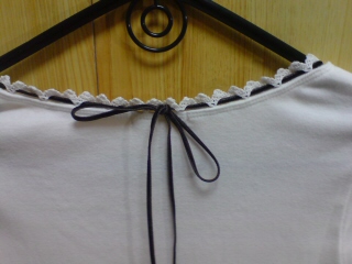 襟ぐりのレース(?)とリボンがお気に入りです。(ベルベットです。>リボン)でも、どうやって着ようかなーと悩み中。