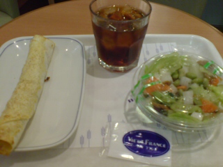 タンドリーチキンのトルティーヤとサラダとアイスティー。タンドリーチキンのトルティーヤというのは焼き立てだと言うので、購入。これが約300円したのにはビックリw(買った後で気がついたwwww)んー。微妙www