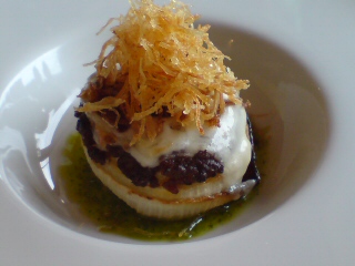 )パイナップルのシャーベット、蜂蜜のかかったチーズ????。この右端のチーズみたいなものは、どうも苦手だった。