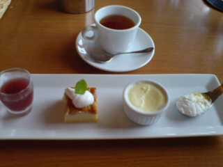 デザートは4種類。飲み物は私は紅茶、おねーさんはコーヒーを。左からイチゴ味のゼリー、次はなんだかわからないけど、カスタードっぽい味のもの。(食感はかまぼこみたい
