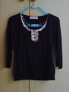 )なんでデジカメって勝手に補正してくれるんでしょうね?上のカーディガンを引っ掛けたところ。ボタンが布でくるまれてあるのが可愛い感じです。しかし、色があまりにも悪い。。。。と言うわけで、妹の黒の方は、デジカメの補正を掛けまくって撮りました。