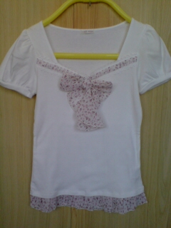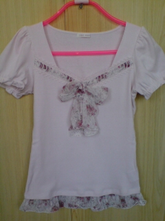 それから、もう一つ。これは、上の二つとはちょっと形が違うの。袖のところにフリフリがないのですよ。それから、リボンの模様が違うんですね。妹が言うには、袖の形は好きだけど、このリボンの模様がいやだ。。。。だって。なんか小さなバラがついてるような模様だったんです。そうじゃなくて、もっとゴージャスなバラの方が良かったらしいです。