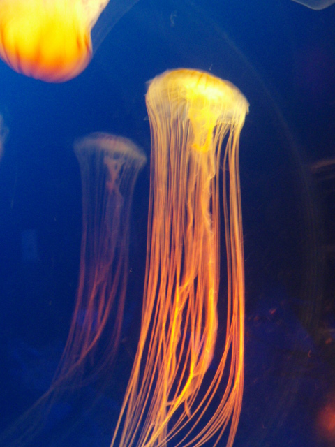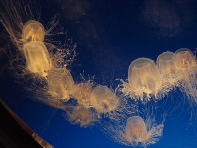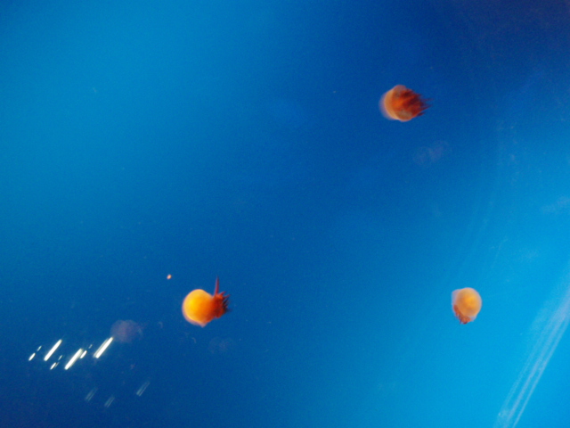さて、これで最後。最後の方に、くらげのコーナーがあるの。ここって、意外ときれいなのよ。写真で伝わりにくいのがすごく残念なんだけど。。。。クラゲがふわふわと浮遊してる感じとかきれいに発光してる感じとかもっと伝わるような写真だったら良かったんだけど、残念ながらワタクシ、それほどの腕は持ち合わせておりません。。。。。