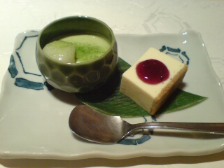 左の抹茶のムース。これ、普通なら、リカは食べられない。ところが、豆乳を使っているので、大丈夫みたいなのです。生クリームとかだったりしたら、もう絶対だめだった。右のレアチーズケーキも豆乳を使っているとか。