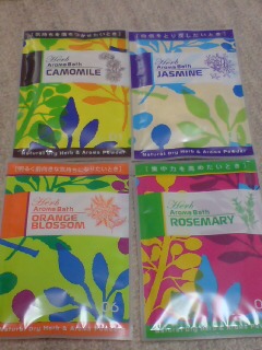 意外とたくさん入浴剤ってありますね。田舎ですら、こんなにあるのか。。。ってぐらいあります。まだまだ種類はあったけど、4種類だけ買いました。なかに袋が入っていて、袋ごと浮かべるようなタイプです。袋の中にはハーブが入っていて、集中したい時にいいとか色々書いてあるんです。全体的に、色がつきにくい感じでした。匂いもあまりわからない感じ。ちょっと微妙ですが、お風呂に入りながら、入浴剤が溶け出してくるのを見て、「ハーブと今、混じってるのかな~」とか思いながら見てました。割と自然な感じのする入浴剤でした。