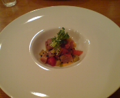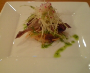 んで、これがでてきた。マグロだったらしい。なんとかのカルパッチョって書いてあったような気がしたけど、マグロになってしまったらしい。で、「マリネみたいになりますけど、よろしいですか?」って。正直、私はカルパッチョ=なんか生みたいなやつ、マリネ=なんか油のかかったサラダみたいなやつで生のやつねとかぐらいにしか思ってないわけ。しかも、その認識で正しいのかどうかも知らない。