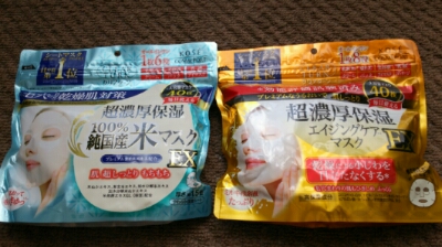 今は米エキス配合の左の水色の袋のものを使ってます。どっちから使うか悩んだんですけどね。後、肌荒れしないかとかも悩みました。でも、この枚数で、980円。安いのとダメならダメでやめればいい。やめても、さほど惜しくはないかも…そんな感じで。