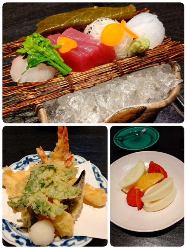 お刺身、天婦羅、フルーツ。