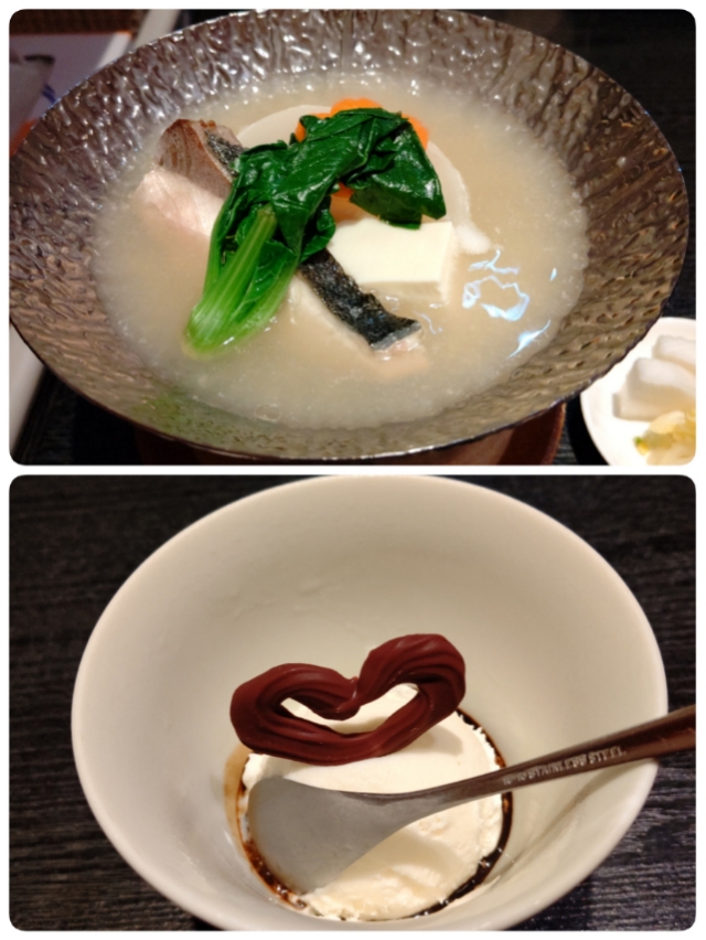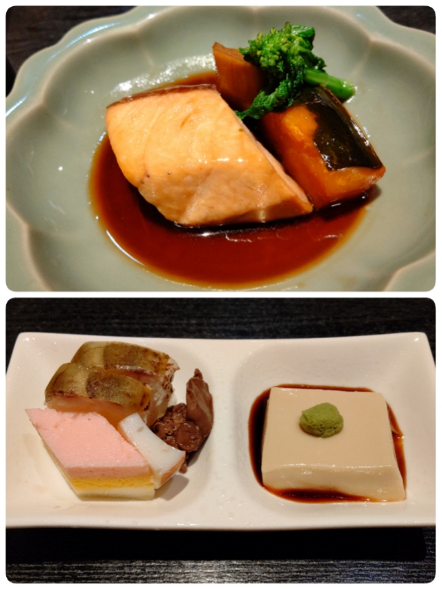 鯖寿司、鶏の肝の煮付け、かまぼこ、ひし形の食べ物(なんだろな?卵のようでしたが)、ごま豆腐が最初に出てくる物です。