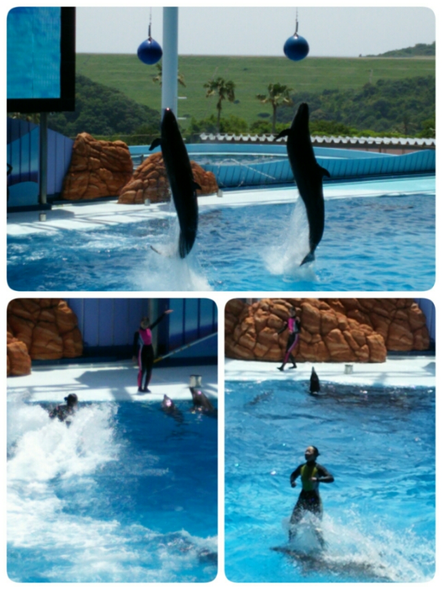 イルカの数も多く、人間がイルカに押してもらって、水上スキーみたいなこととかやってます。かなりのスピード感で、すごいの。