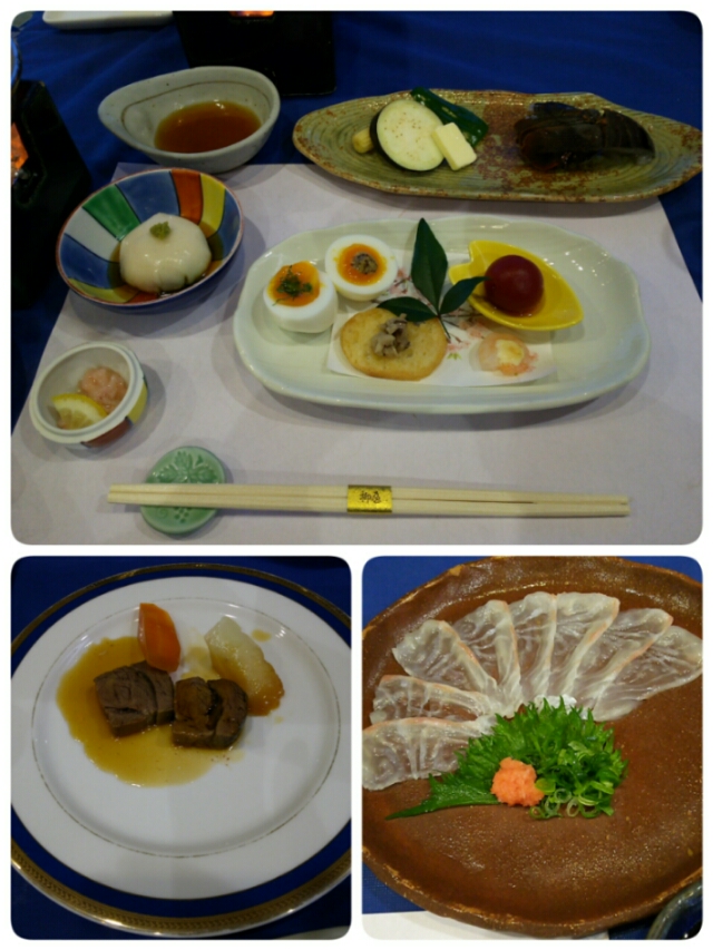 左下は牛肉の大和煮みたいなもの。右下は鯛の身を薄く切ってあり、ポン酢で食べます。